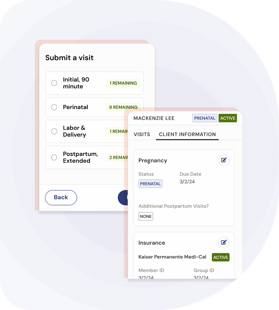 The Loula Portal makes insurance billing easy—check your clients' insurance eligibility, submit visits in less than 5-minutes, and track your client's doula benefit.